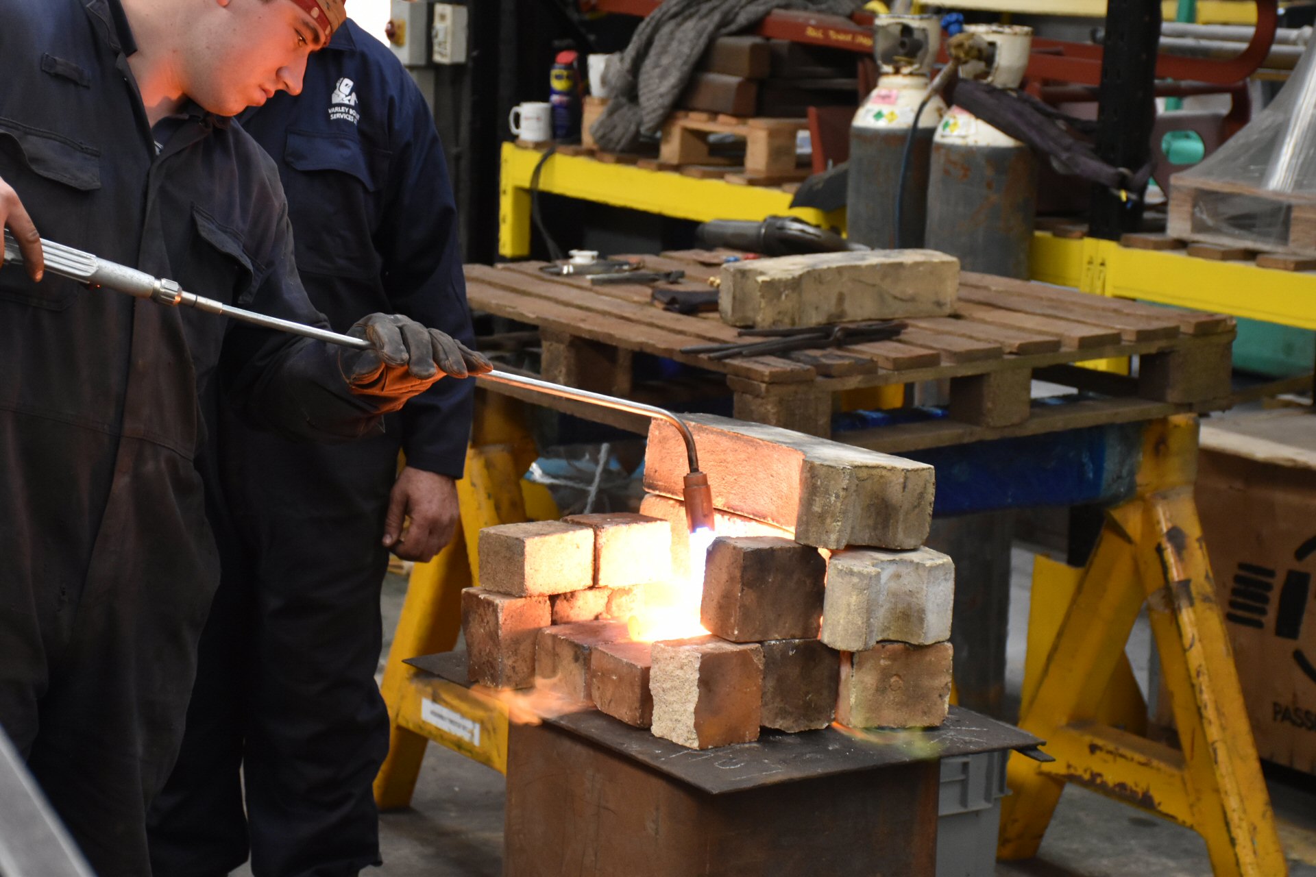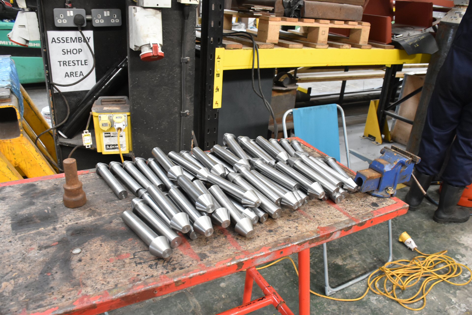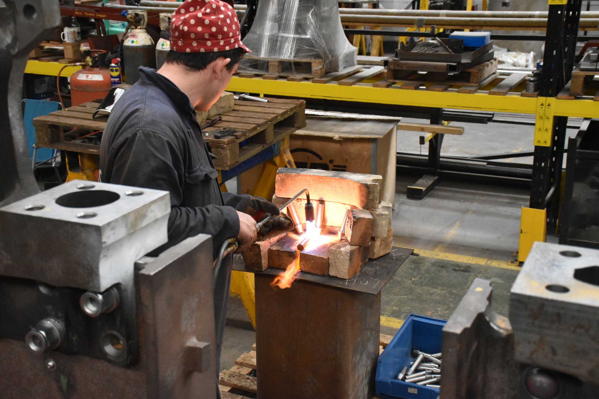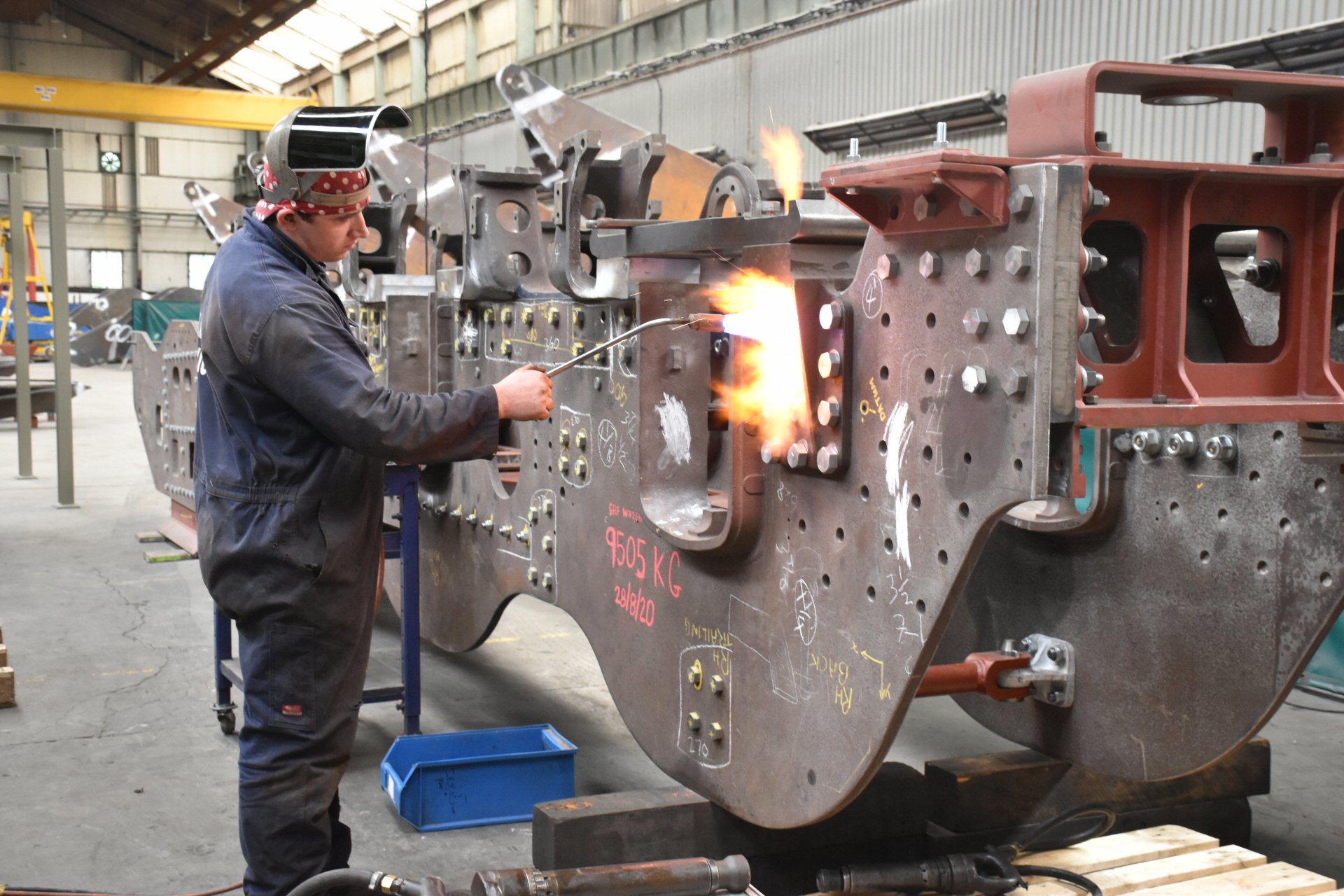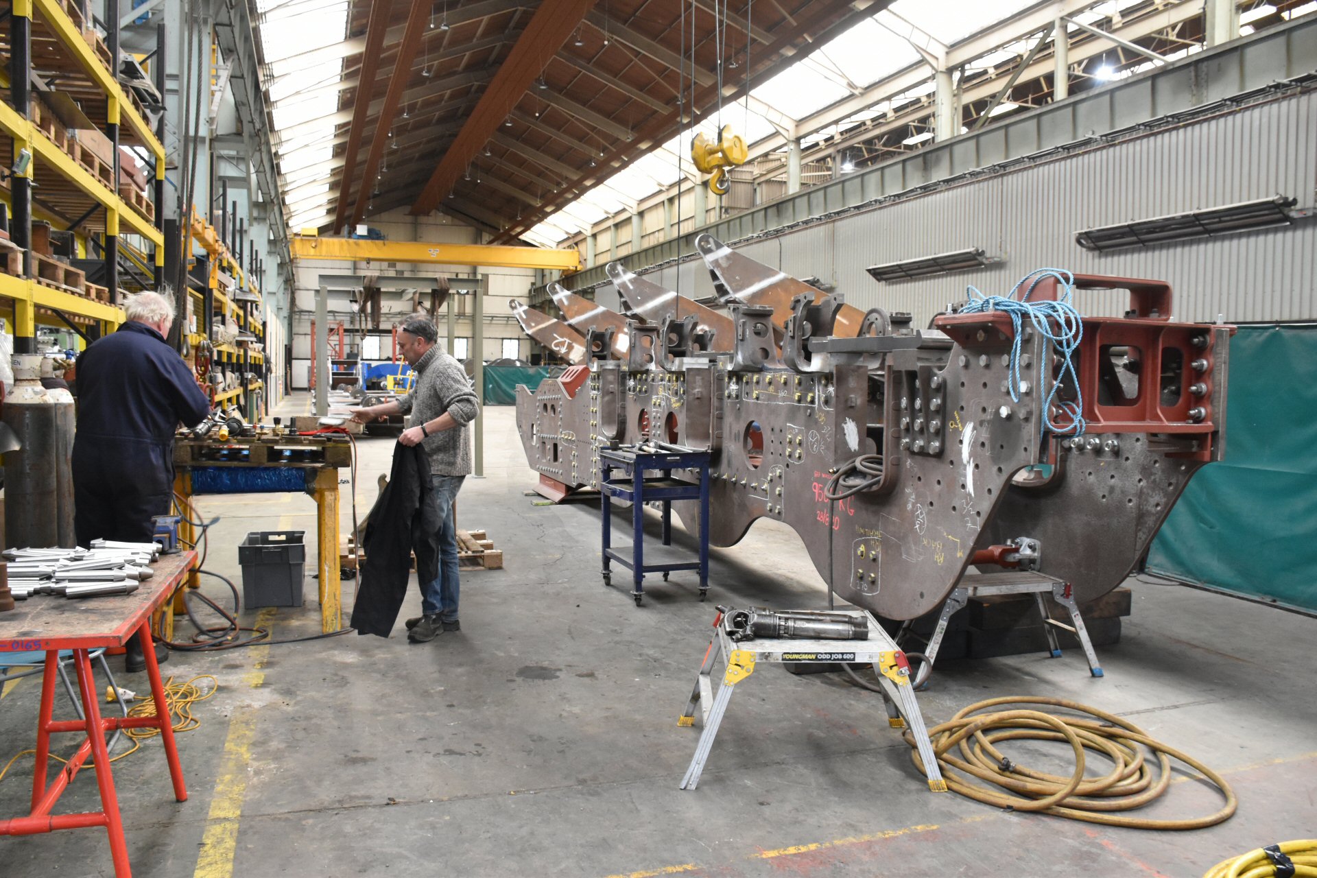 Our original design aim was to use fitted bolts when assembling the frames - the reasoning is explained in the design section of the web site. Once the frame to cast steel stretcher bolts were fitted, it became obvious that the some of the bolts were preventing the frame keep bolts from being fitted. In the image, the frames are upside down and the frame keep is at the top, itself upside down and fitted as a temporary stay. The 4 bolts each side of the hornguides marked "R" are the bolts that need to be replaced by rivets. On Saturday 29 August, Varley Boilers were on site to fit the rivets.