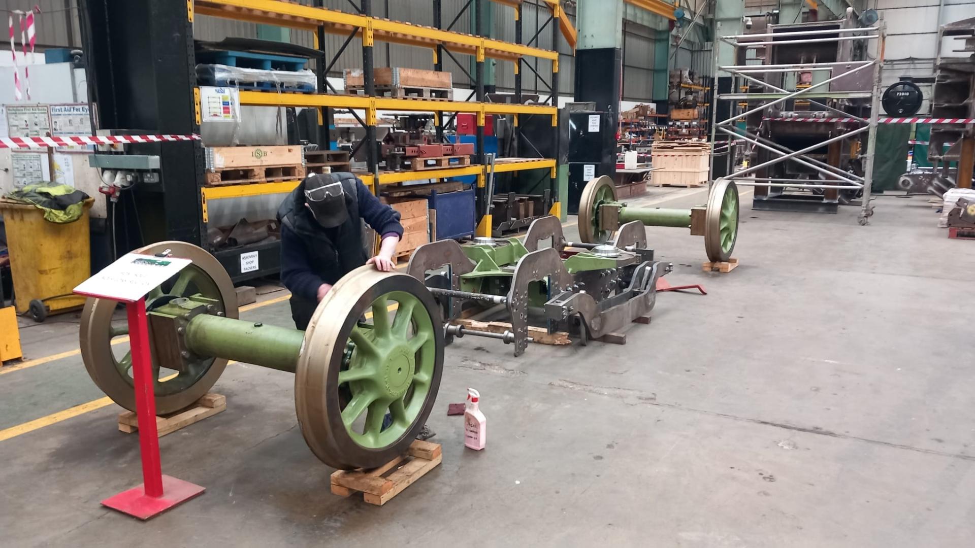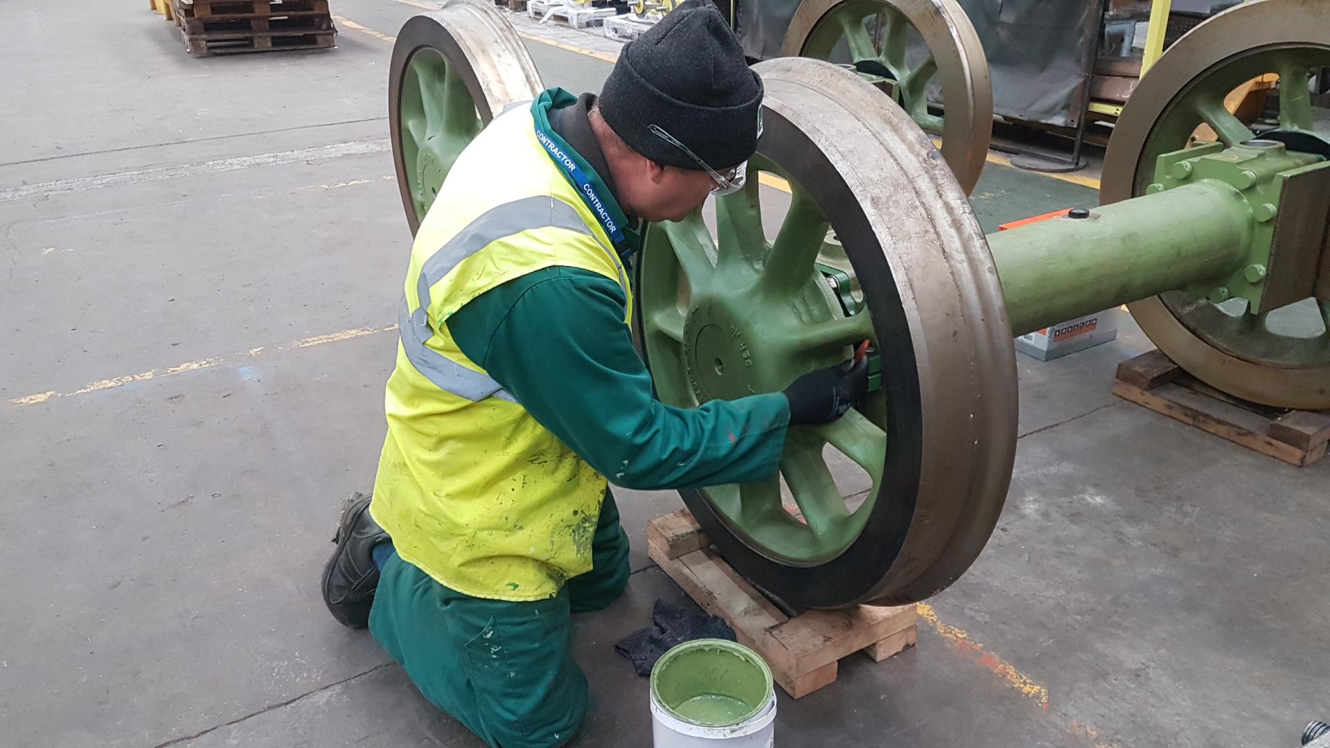 Ashley gets to work painting the remaining bare metal parts of the bogie wheelsets after their return from South Devon Railway Engineering. |
