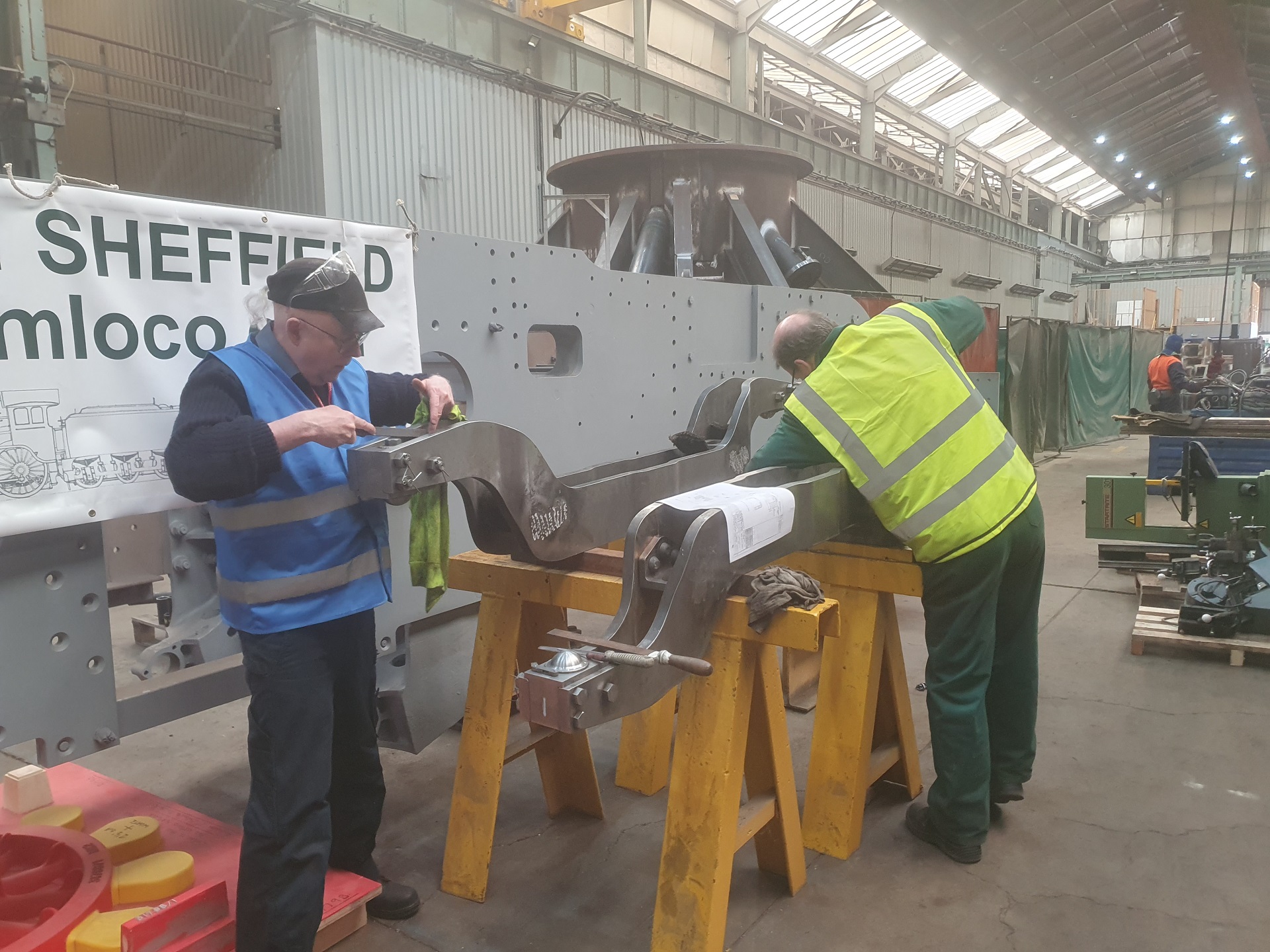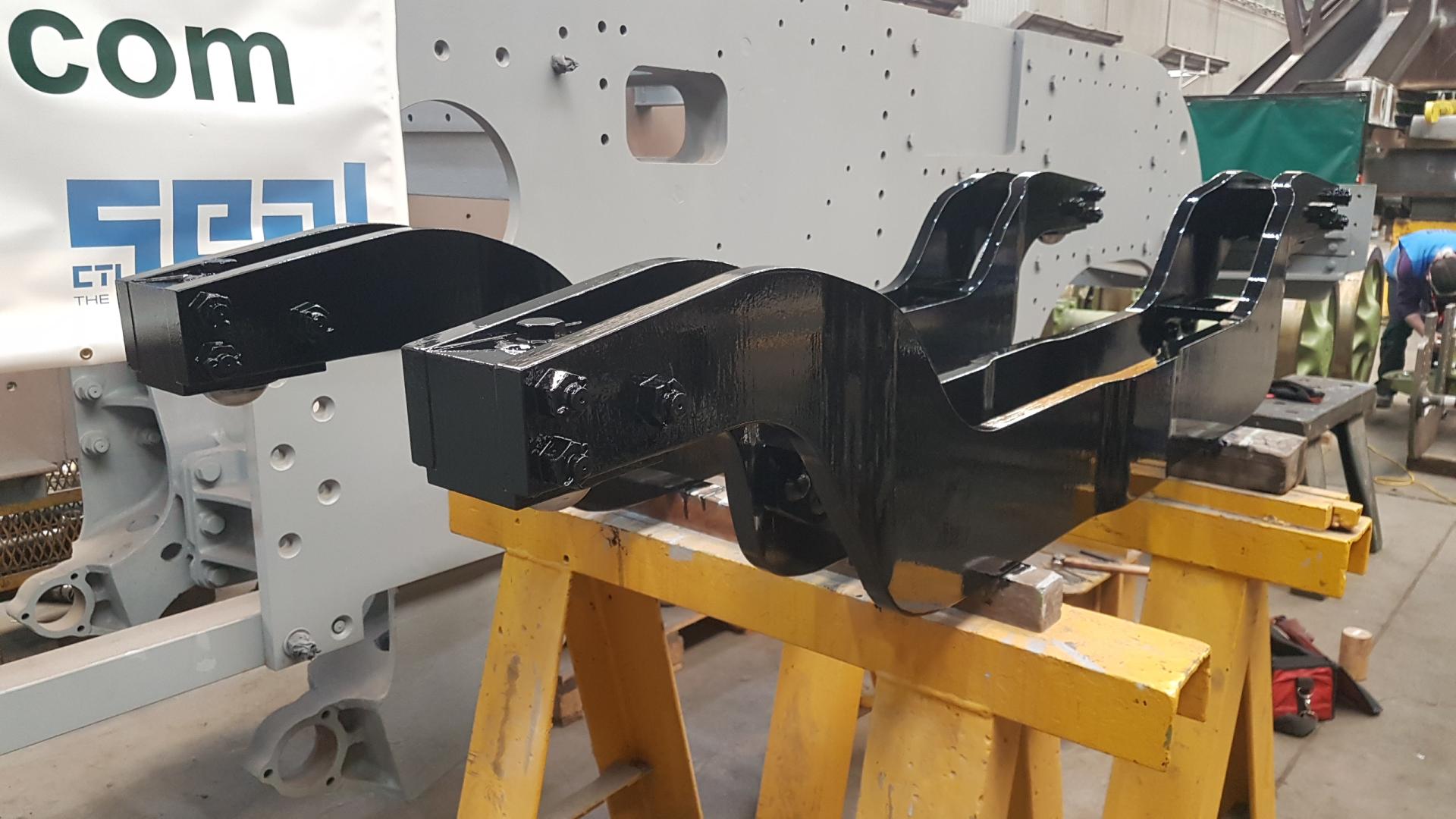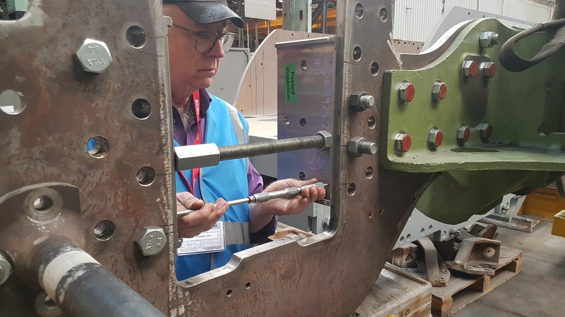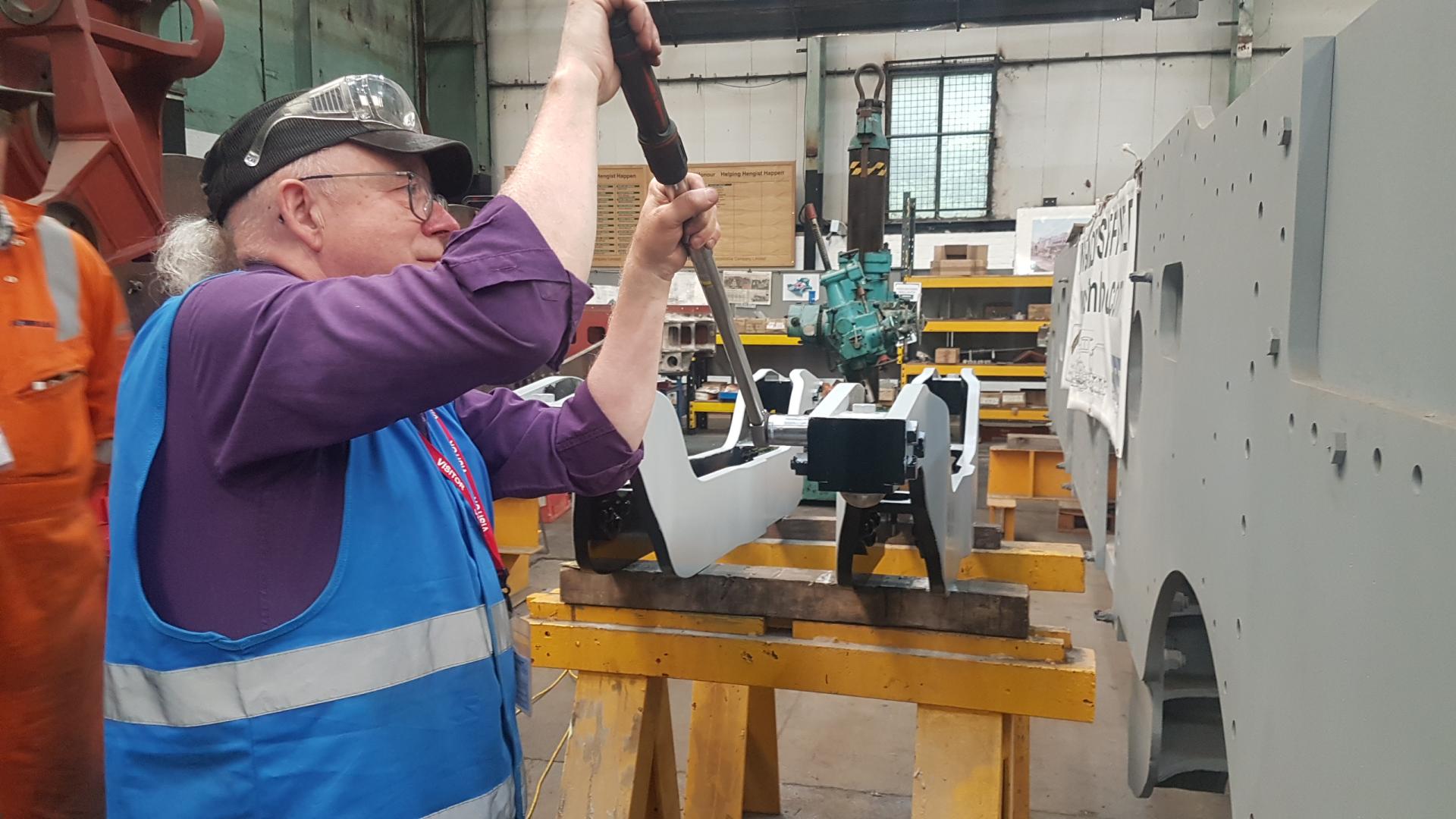 Bogie Spring Cradles. Before Ashley applies the top coat of paint, John checks the torque setting of the fasteners and fits the split pins. |