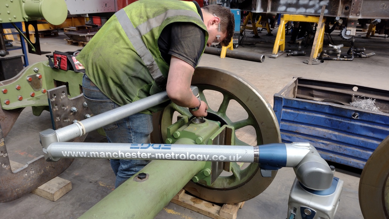 Liam from CTL, using a Faro Arm to check some dimensions on the axleboxes, so that we can accurately machine the liners that will be fitted to the bogie axlebox guides.