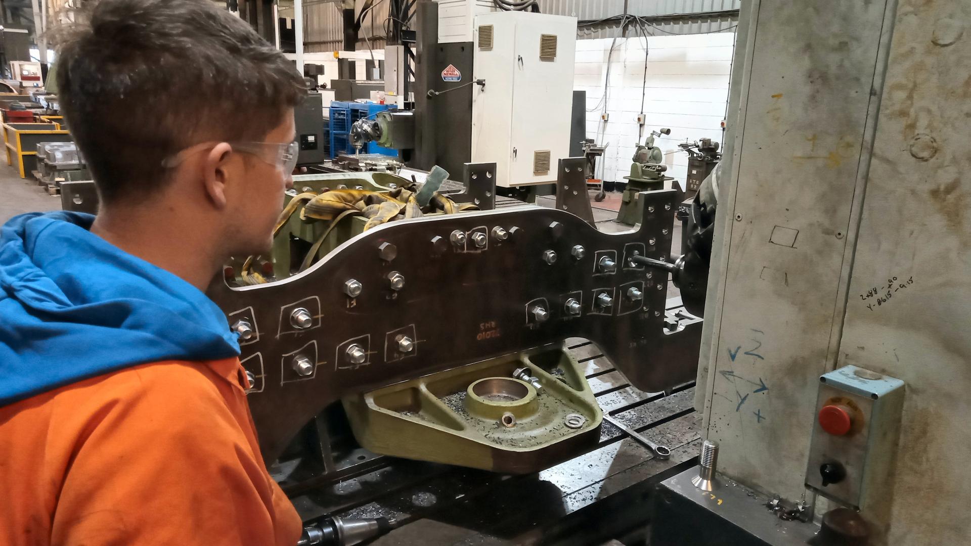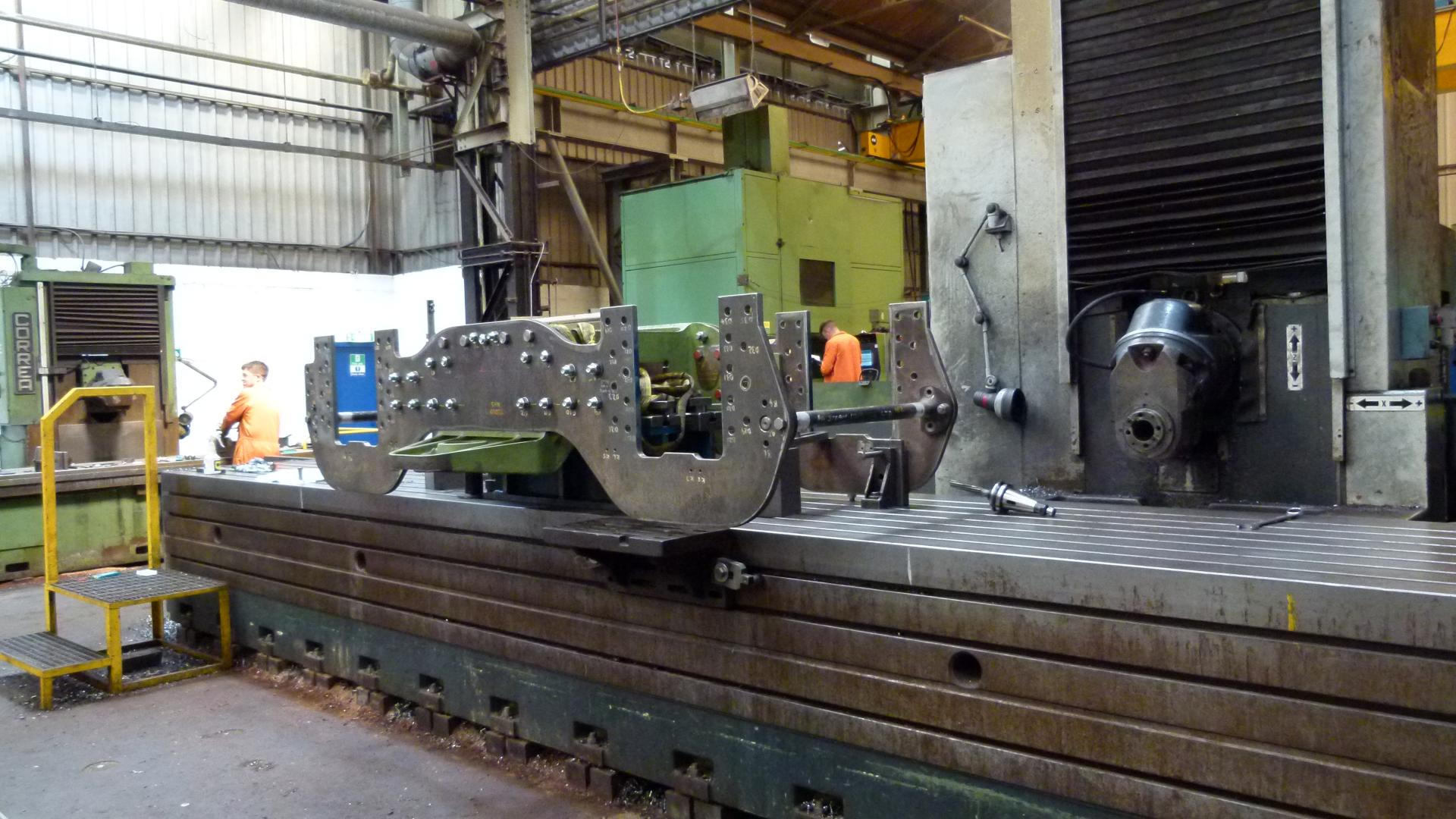 Here the countersink is being formed in the bogie frame plate. |