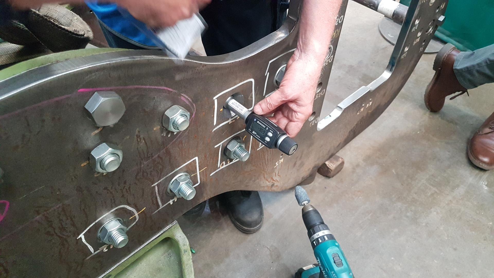Once the countersinks have been formed, the assembly was returned to the assembly shop. Next job is to measure the hole diameter with a Bowers gauge. We can then order the bolts. |