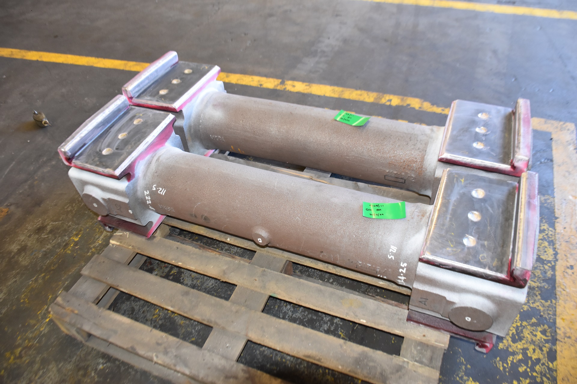 The bogie and driving wheel axleboxes are different. As the axleboxes are inside the wheels, the 2 axleboxes are kept apart by a tube cast into the whole assembly. As the tube is similar to a cannon, these are called cannon boxes. The early design of cannon boxes were split horizontally (as fitted to 60163 Tornado) whereas the BR locomotives were fitted with solid cannon boxes. Here are 72010's bogie cannon boxes waiting for stage 2 machining.