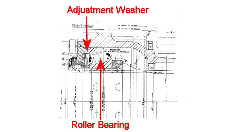 This arrangement allows the use of only one bearing per side. The bearings are kept opposed by the axle (the spacer in the Trailing Truck design) in the cannon tube. An adjustment washer, between the end cover and the outer race, is in halves to allow the adjustment to be removed and then to be machined to provide the correct end float.
