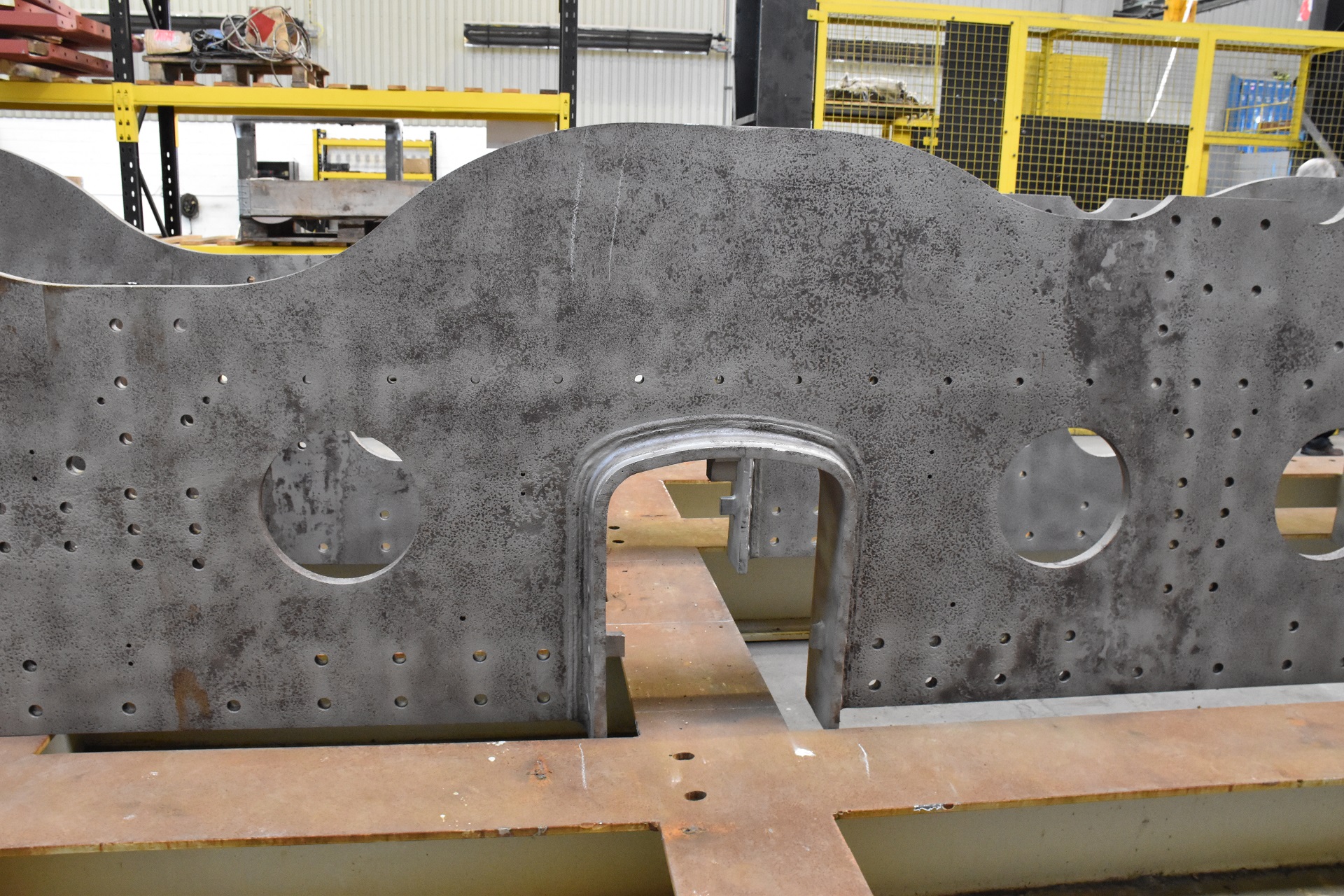 Whereas we don't have any knowledge of frame fatigue cracking on the Clan locomotives, fatigue cracking developed on the Britannia class after circa 438,000 miles of use (approximately 6 years at 73,000 miles per year). The main areas were above the rear bogie wheels, the top corner of the horn guide cut out and around the slide bar brackets. The horn guide area is shown in the photo below; the horn guides are not yet machined.