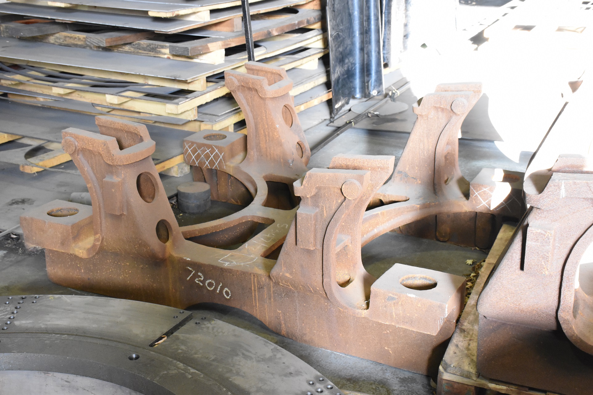 The horn guide problem area was recognised in the Lot 242 design in that the next batch of Clans were to be fitted with 3 off cast steel stretchers instead of fabricated stretchers. The cast stretchers were fitted to the Duke of Gloucester and better support the area around the horn guides. The photo below shows an upside down stretcher awaiting machining. The four 'legs' will support the main driving wheel springs.
