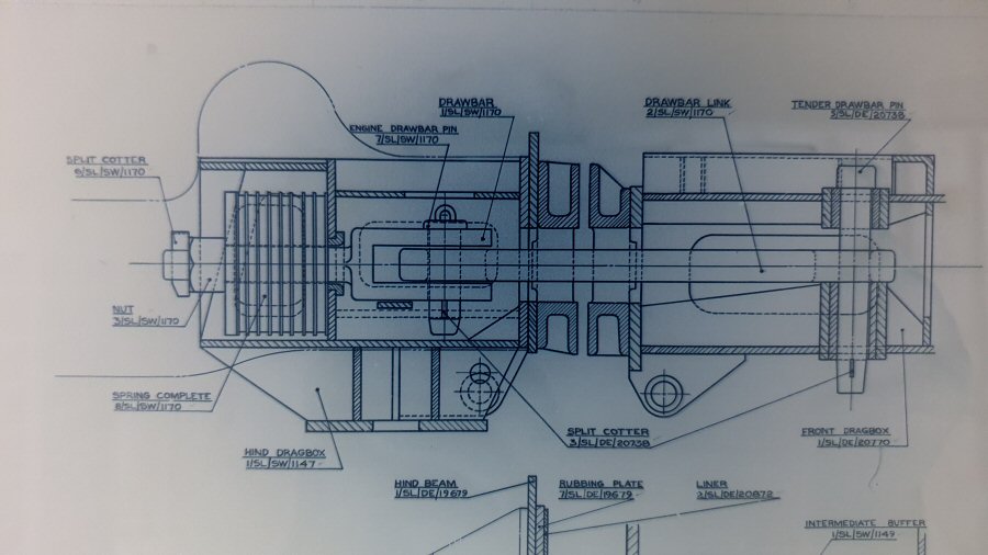 The drawbar drawing is believed to be SL/DE/19683 dated 14 June 1950. The drawing shows an eye in one end for a vertical pin in the engine dragbox and a threaded portion at the other end for the drawbar spring bearing on the tender dragbox. It is assumed that the tender dragbox drawing is SL/DE/20300. SSLC refer to this as the Mk 1 drawbar system.