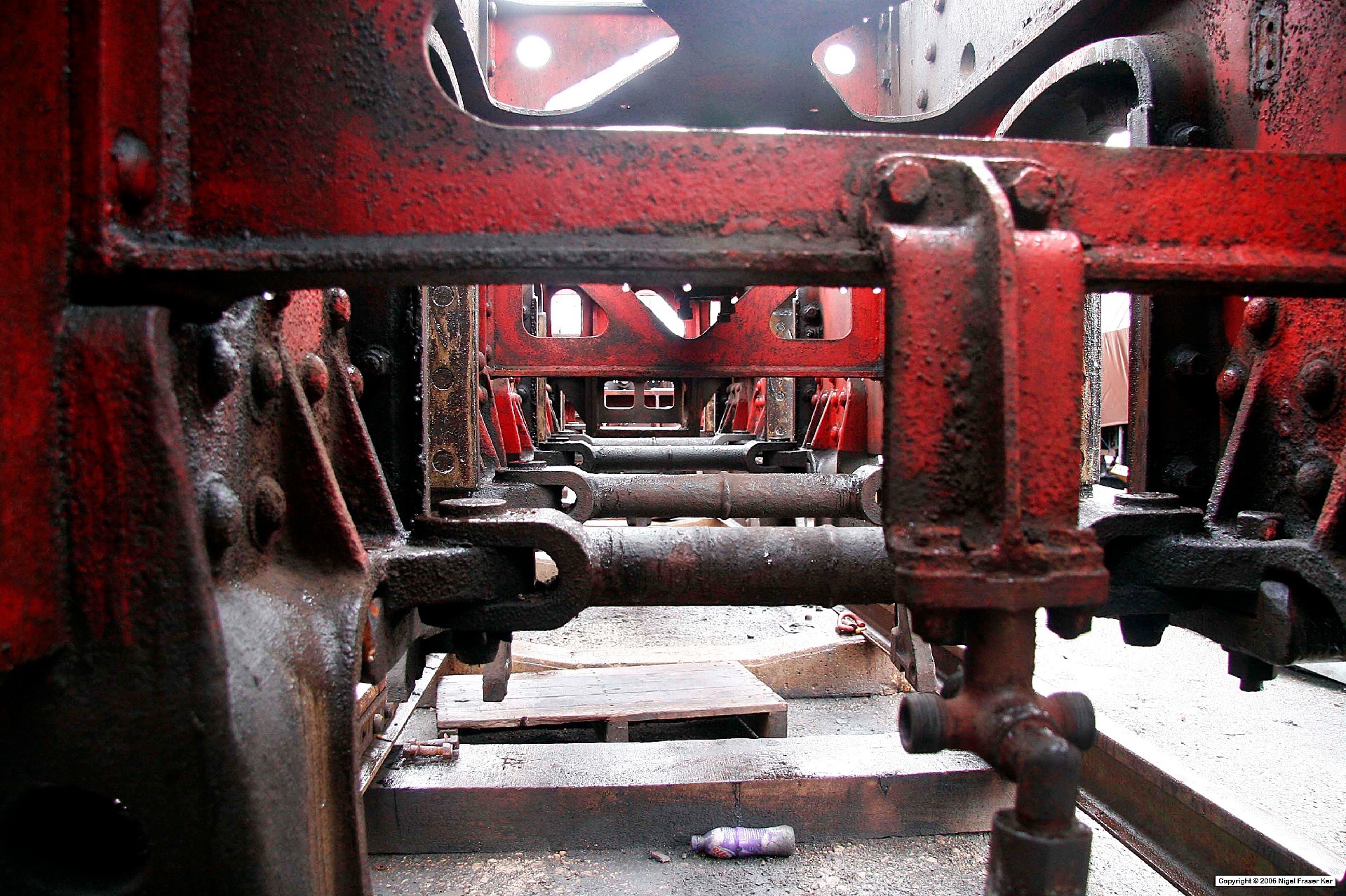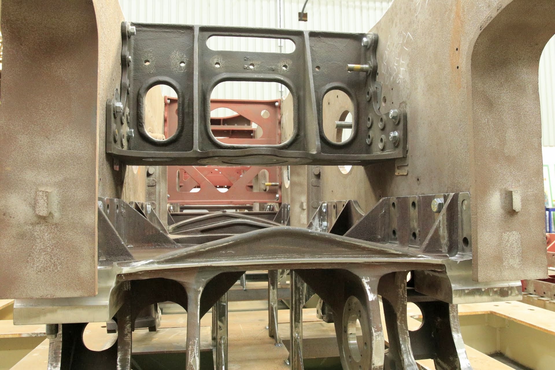 The next design change in 1953 for 71000 - Duke of Gloucester was to combine 2 of the spring hanger castings into a single Combined Frame Stretcher and Spring Bracket casting. This photo shows the casting that sits between the leading driving wheel and the central driving wheel.