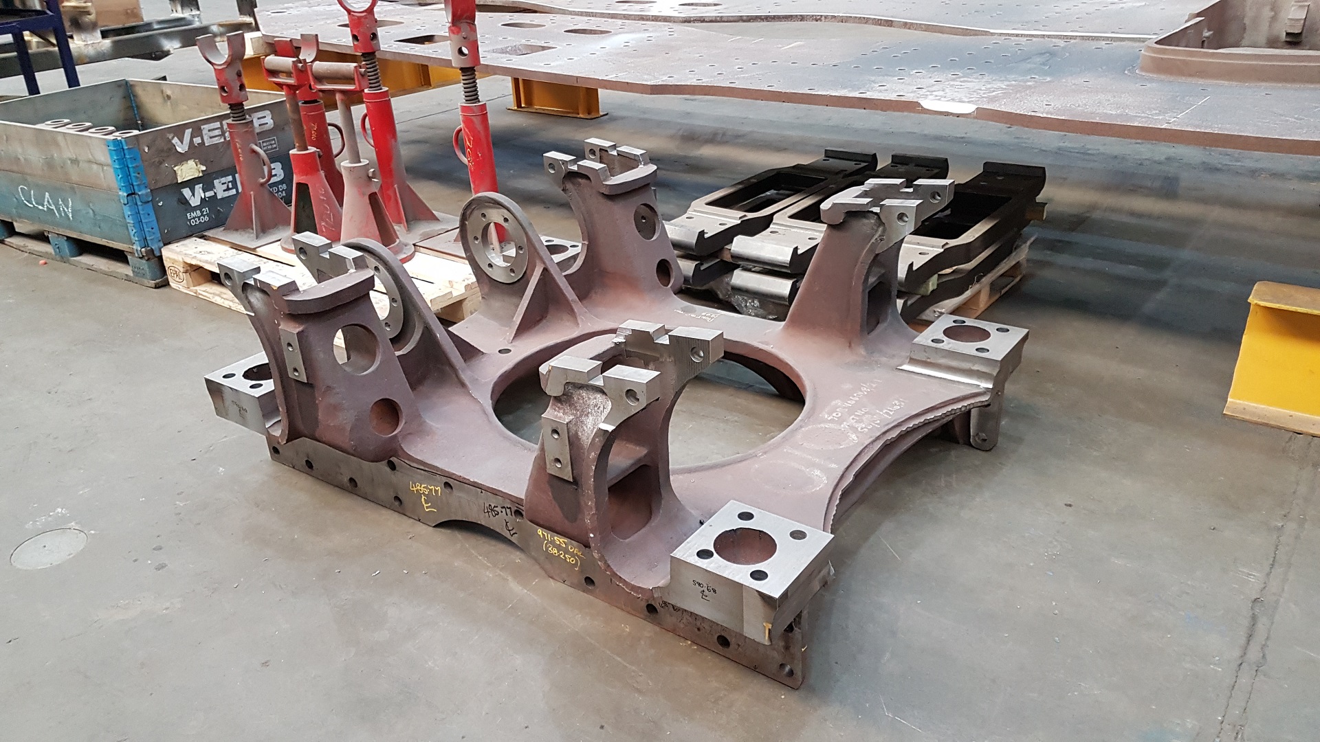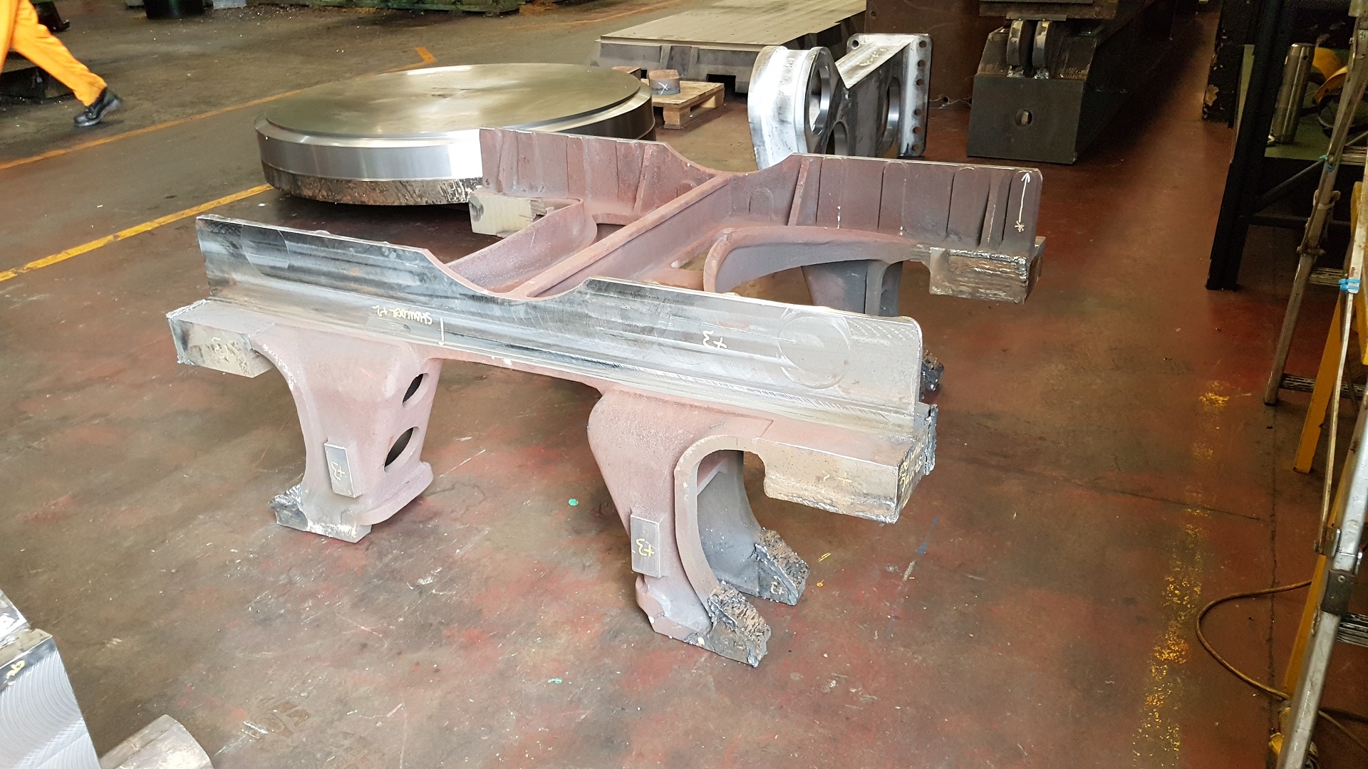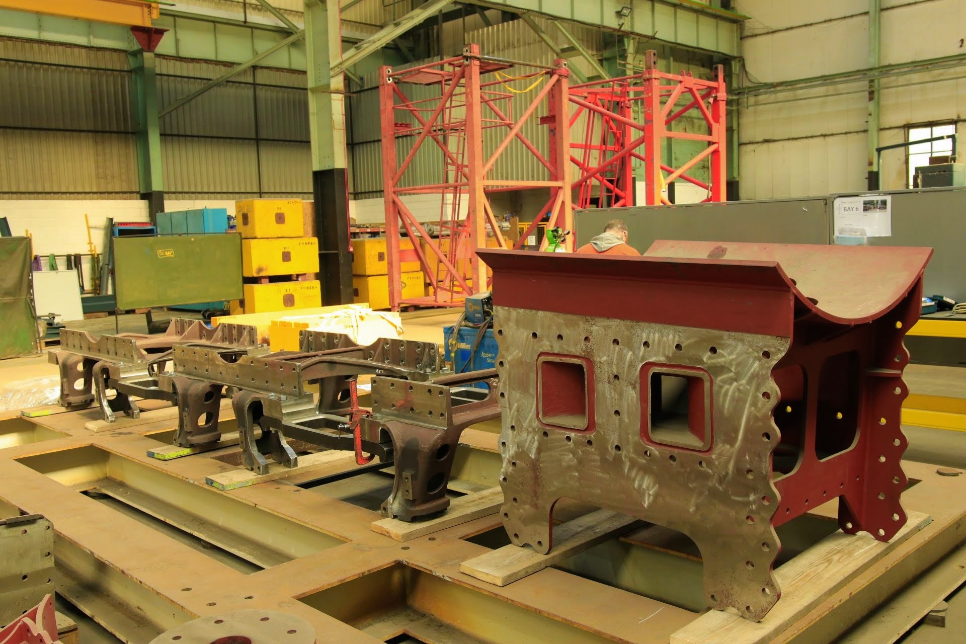 The photo was taken during initial machining operations at CTL Seal. 2 of these "4 legged" castings are required, the one between the central and trailing driving wheels is different in that the casting also supports the main brake shaft as seen in this photo (casting is upside down)