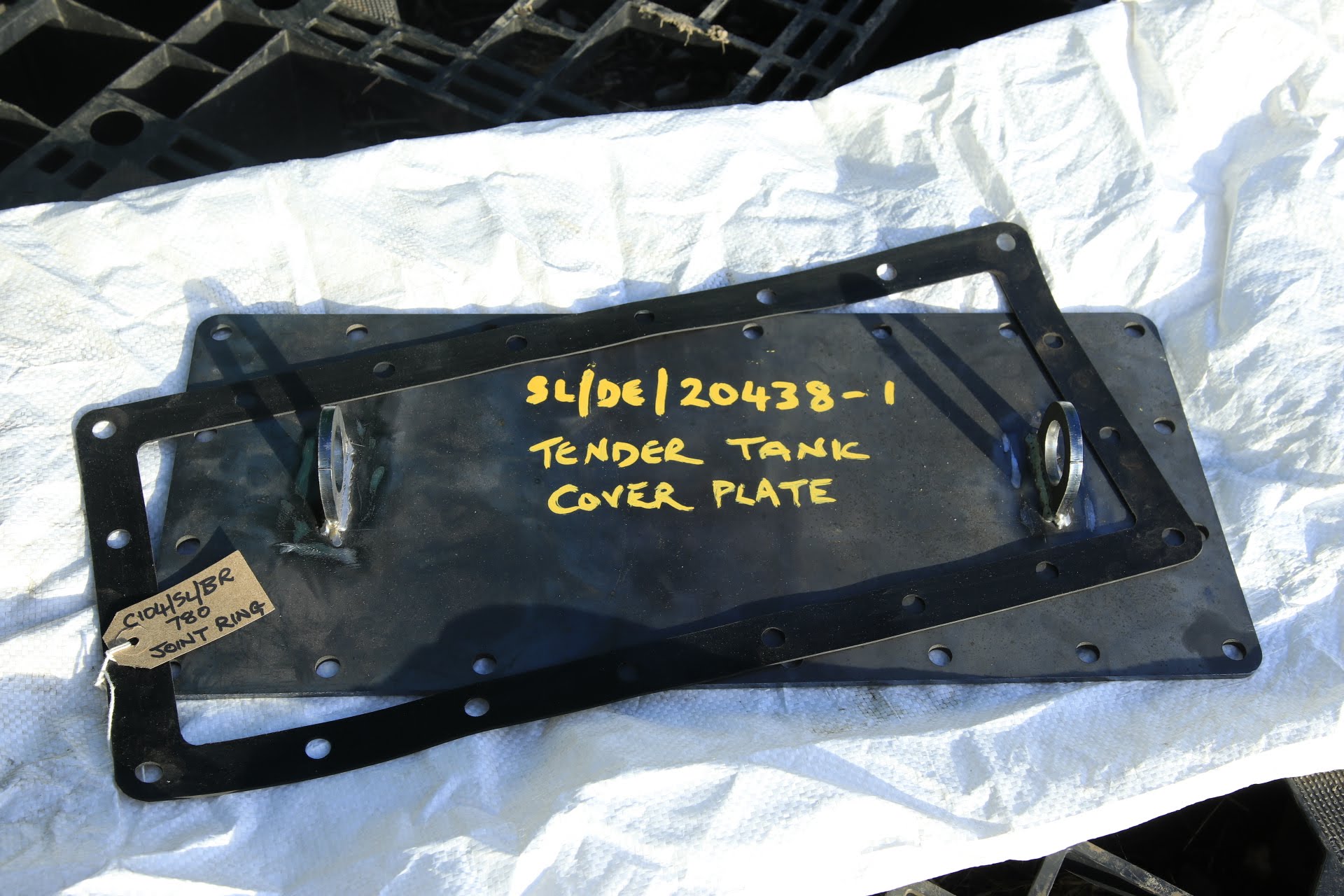 While work on the erection of the Main Frames gathers momentum we have not been idle in other areas, with several other small parts produced recently. Two of which are pictured here, the Tender Tank Cover Plate and its associated Joint Ring. All new metal items are treated with a corrosion inhibitor before being allocated space on the parts racks after being logged into the document database system. |