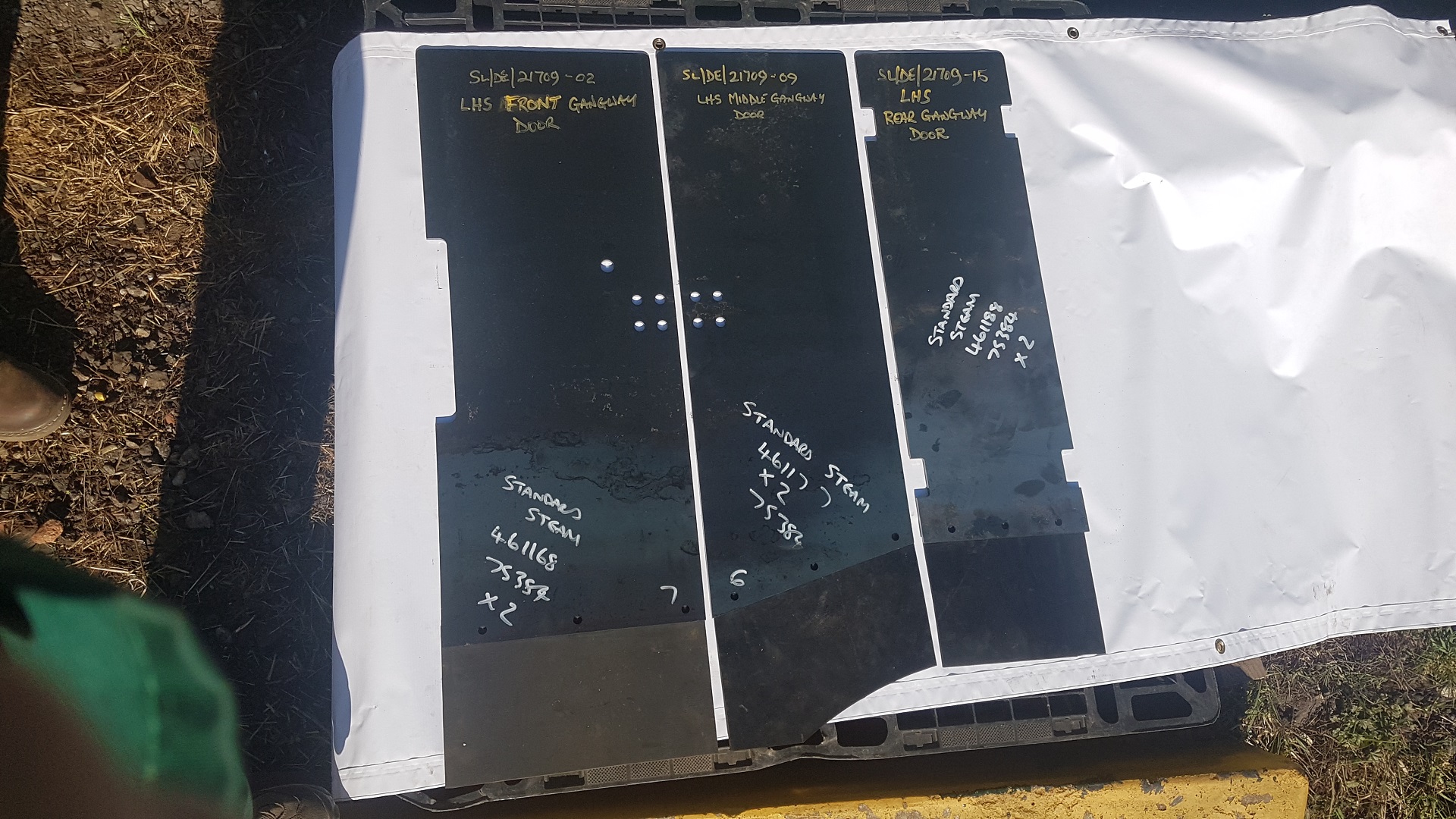 Ashley Shimwell has sponsored a set of tender doors - both sides - which we've had cut by a local company. Here you can see the left hand set, complete with the rubber sealing strips at the bottom. We've lots of small parts that need sponsoring, please get in touch if you can help. | |