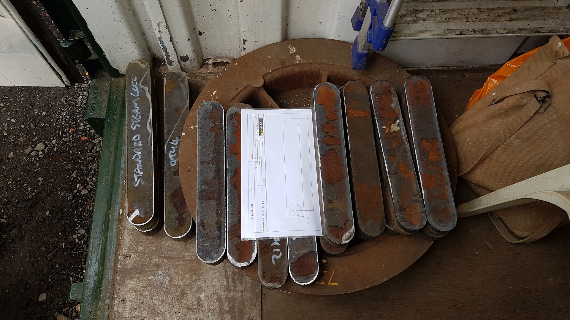Our members continue to sponsor small parts and here are a set of spring links. The four longer ones (to the left of the drawing) are for the bogie. The remaining 12 are for the driving wheels. Although we are focussing on procuring bogie parts, it made sense to get the driving wheel links cut at the same time. The links will now need to slots cut into them for the spring cotters to fit in. This will require machining as the slots have a fine tolerance. | |