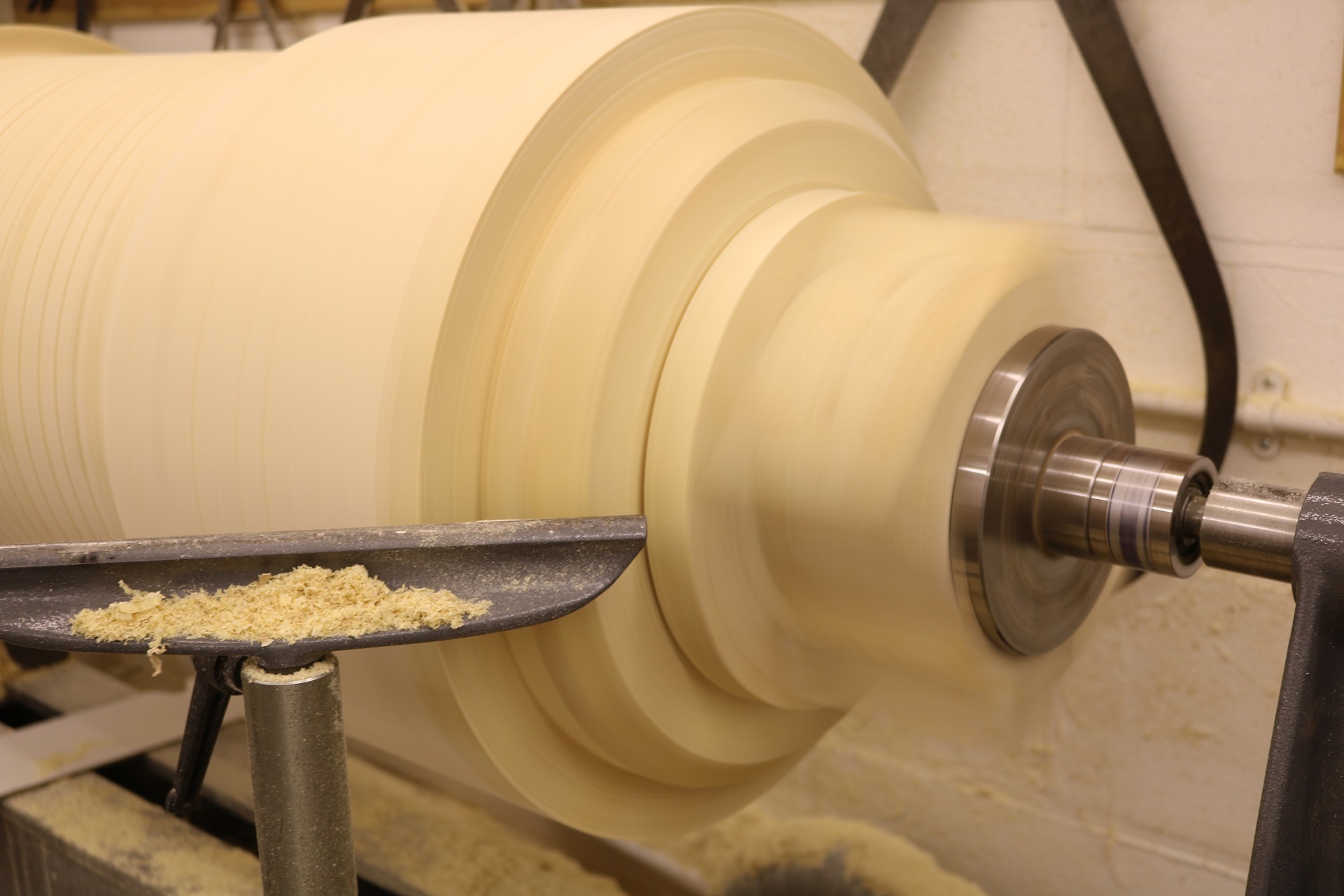 The valve cylinder is 4 foot 10.5 inches long plus or minus 5 thousands of an inch. This is too long for Tony's wood turning lathe, so the pattern (like the main, motion cylinder) has to be made in 2 halves. In the photo, Tony is turning the tapered plug which will fit into a tapered socket on the other half of the pattern | |