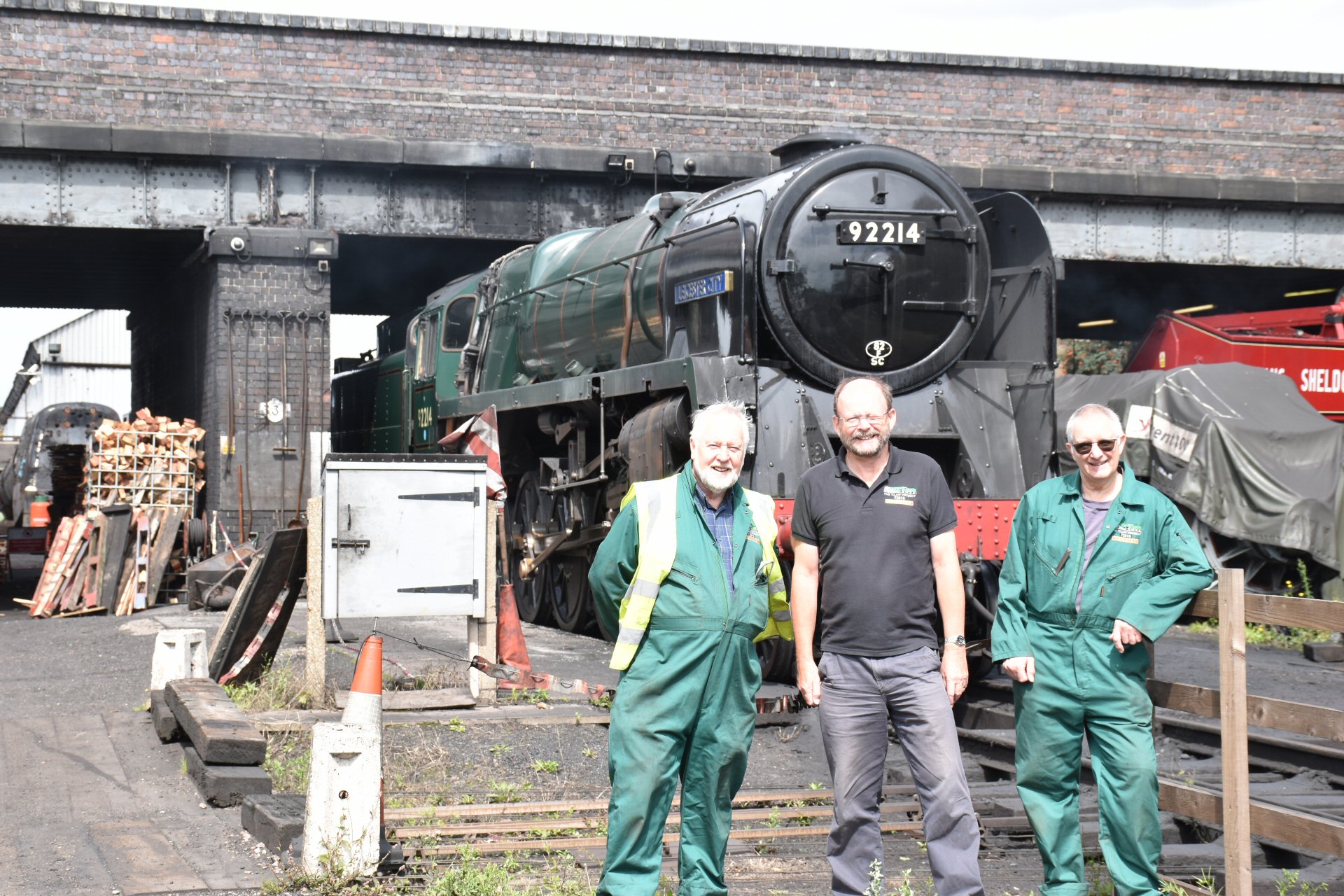 Some of the Monday team went to visit the Great Central Railway at Loughborough today; in particular to have a look at 70013 Oliver Cromwell while the loco was being overhauled. We took the opportunity to have a good look at the bogie components. Also we are missing the drawing for the reverser shaft that links across the frames between the LH and RH motion brackets; this drawing also includes the RH lifting arm. So this was a good chance to get in close and take some measurements. Thanks to Craig and his team for hosting the visit. Alan, Geoff and Keith in front of 92214 which has a BR1G tender which we will want to manufacture. | |
