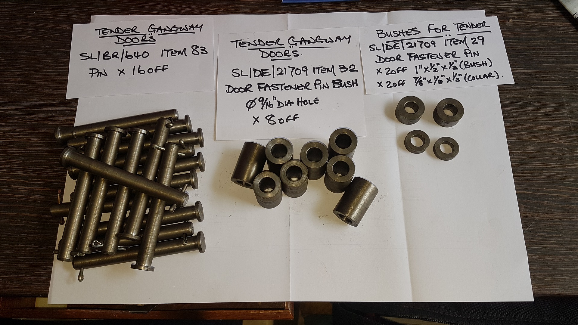 Here's a set of small parts just taken in to stock. On the left are the pins for the tender doors. The tender doors consist of 2 flat plates and a curved plate, all hinged so that they can fold away. In the centre are the bushes for the door fastening pin. These will be welded to the tender front. On the right are parts to help make up the door fastening pin. The 2 larger bushes will be for the "eye" at the top of the pin. This allows a chain to be fastened to the pin. It will be welded to some 3/4" round bar to make up the pin. The smaller bushes are collars, again welded to the bar to stop the pin at the top bush. | |