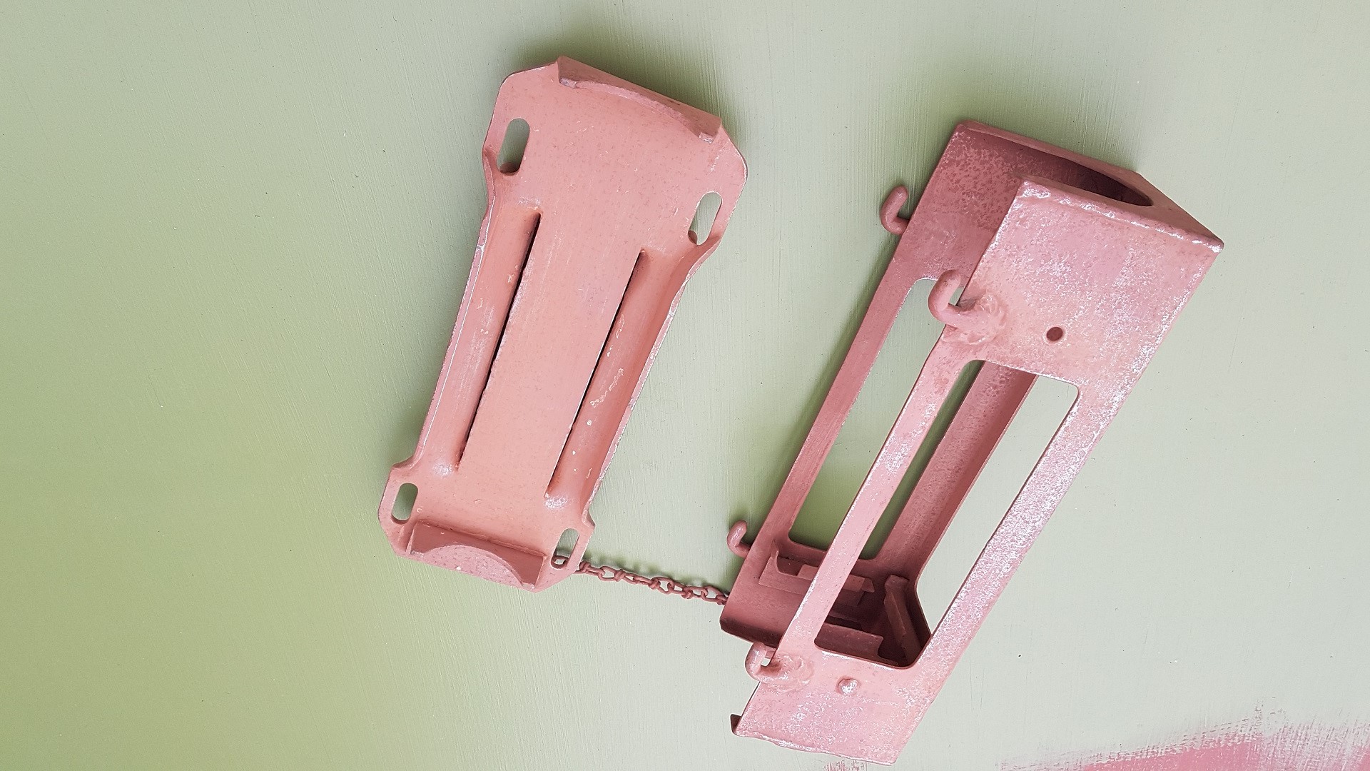 The left hand part is the front and sides and pieces of heavy duty glass fit in the slots you can see. Should the glass tube break (and the water inside is at boiler pressure) the protector will contain the pieces. We have 3 of these so today, Mike and Ashley decided which were the best set. They have been stripped down to bare metal and received a coat of primer. |