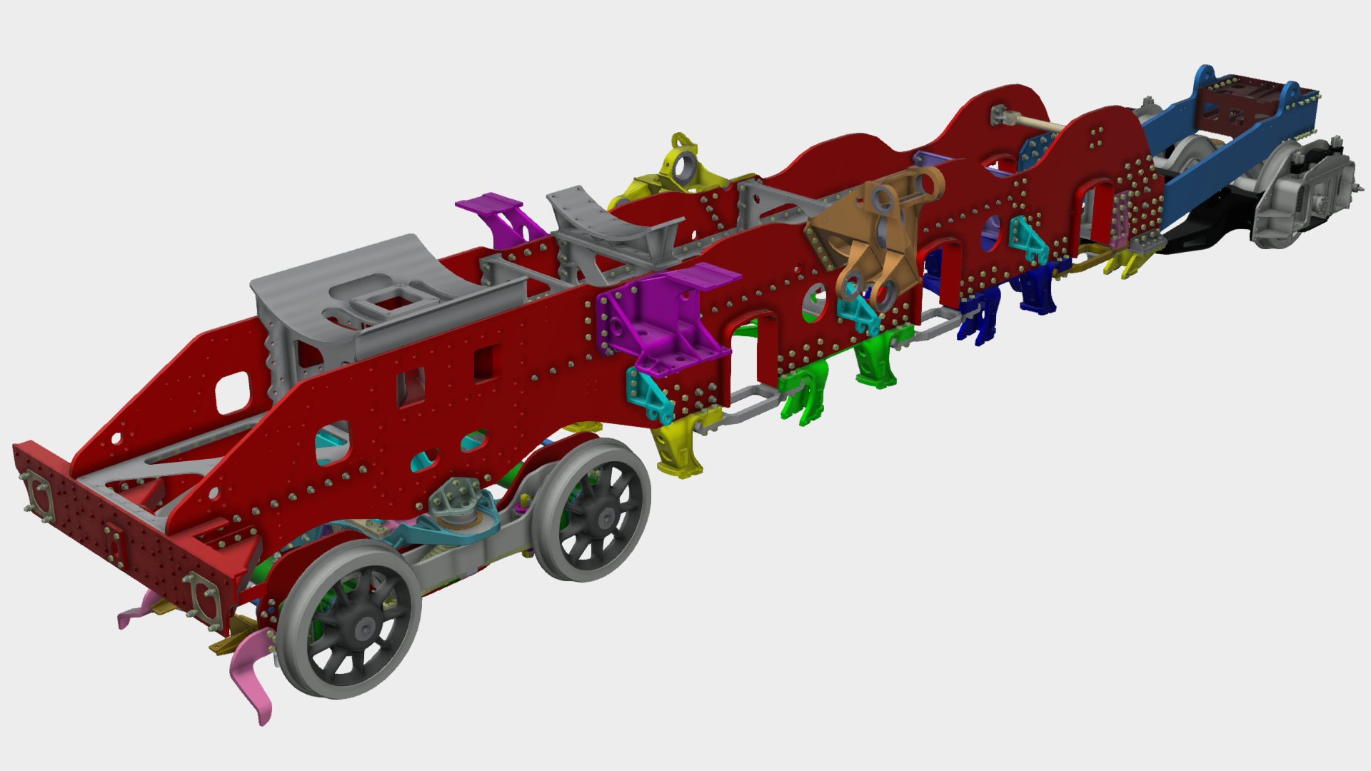 Keith Greenhow, ably assisted by Alan Marshall and James Conway, has now updated our 3D CAD model to include the bogie and the pony truck. The model has been of enormous benefit in determining the fixings for the bogie as it allows us to examine clearances from all angles. |