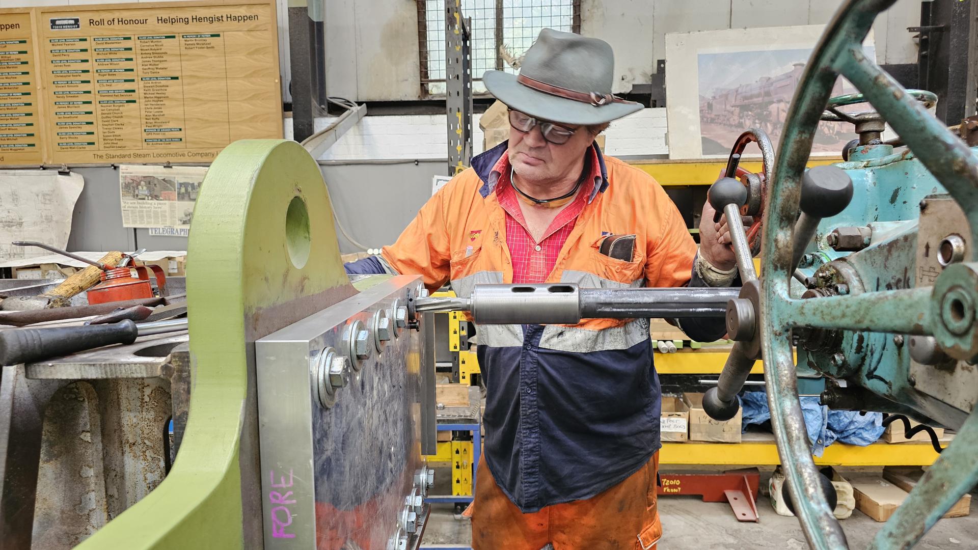 The drill jig is now being used to open out the bolt holes to secure the dragbox in the frame extensions at the rear of the locomotive. Here Mike is reaming the second bolt hole using a drill bush in the jig. Note how all other bolt holes and filled with temporary bolts to ensure that everything is firmly located in place. You can see the steel plates at the back and bottom of the jig which locate the plate against the 2 datum faces. |